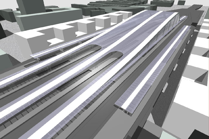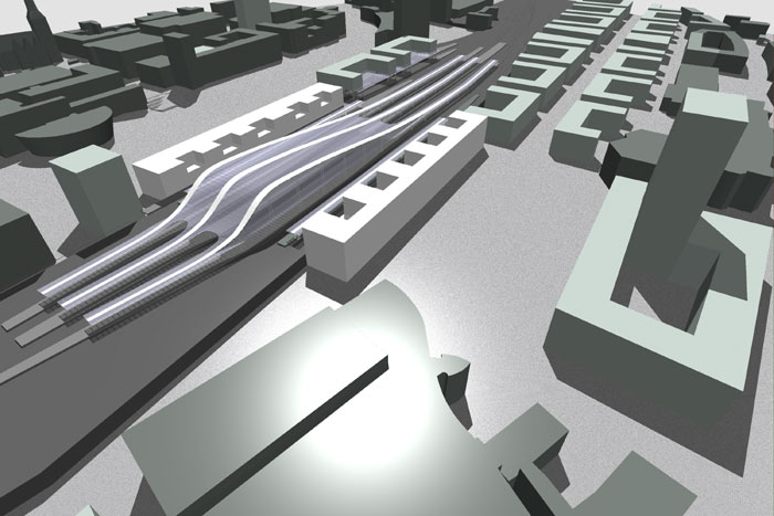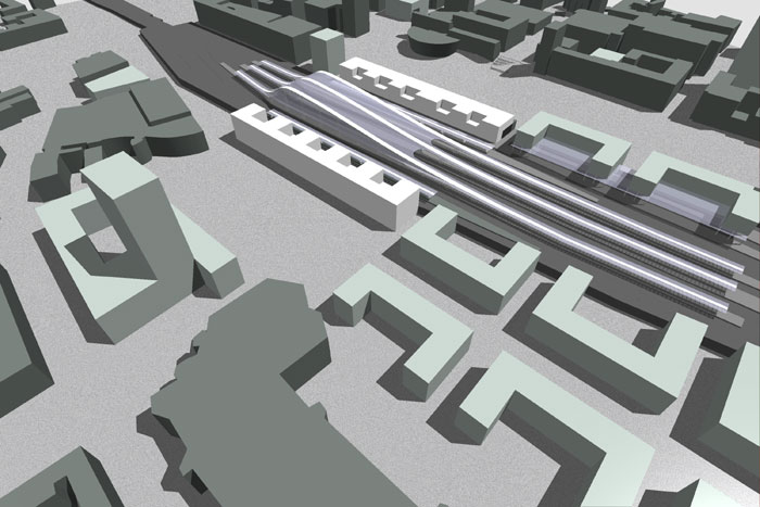Die Bahnhofshalle und die qualitativen Baukörper der geplanten Bahnhofsneugestaltung
